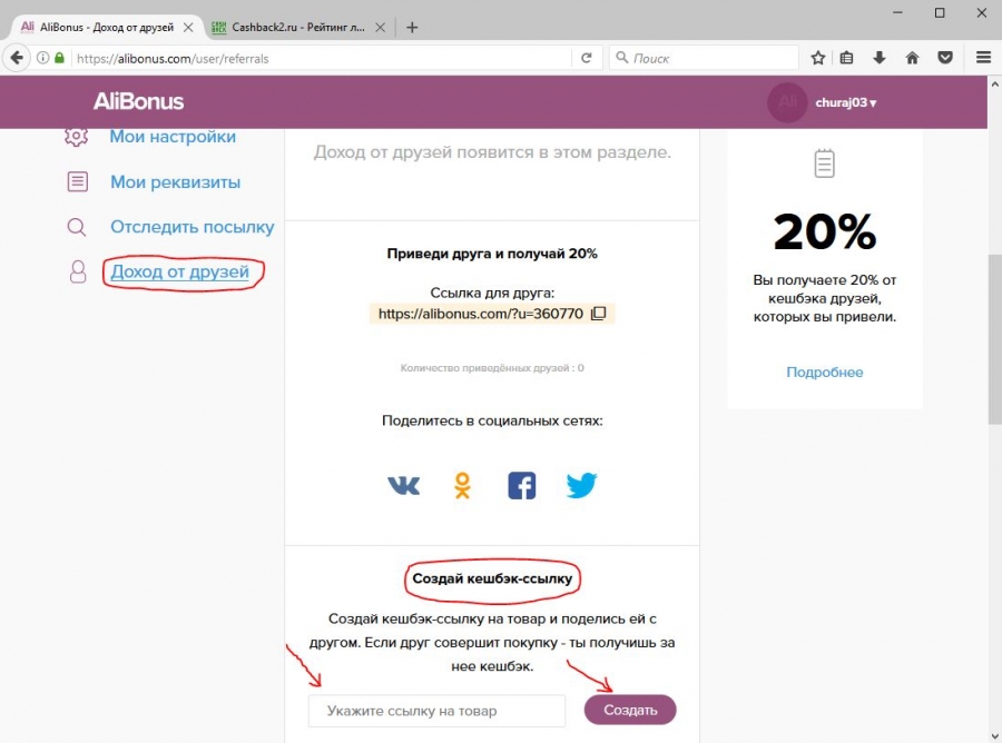 Собственная партнерская программа Alibonus предполагает выплату 20% средств от кэшбека, оформленного приглашенным пользователем (рефералом).