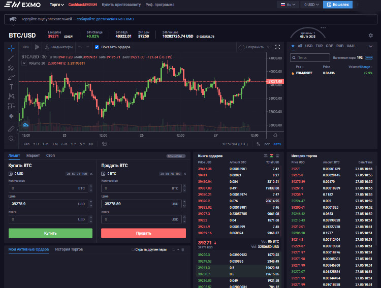 - EXMO. Биржа, открытая в 2013 году. Здесь представлено 17 торговых пар, причем можно торговать как криптовалюты, так и фиатные деньги.