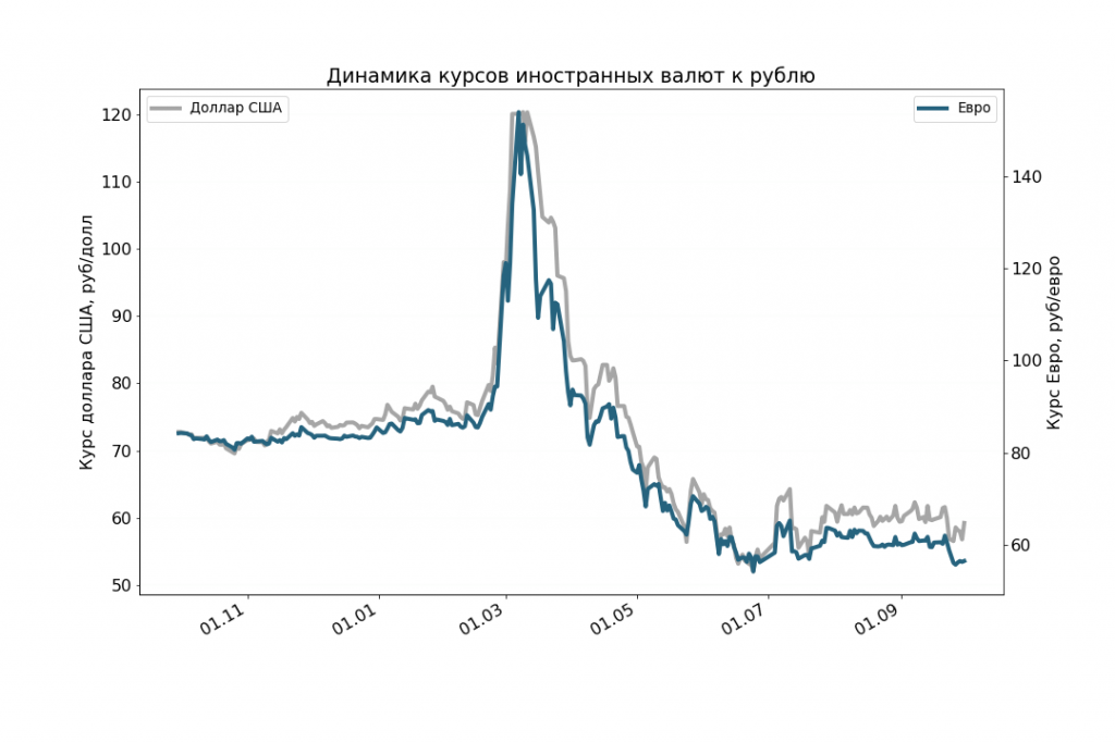 В первые дни конфликта на Украине российский рубль потерял примерно половину своей стоимости, поднявшись с 84 рублей за доллар до вторжения до 154 рублей за доллар к 7 марта.