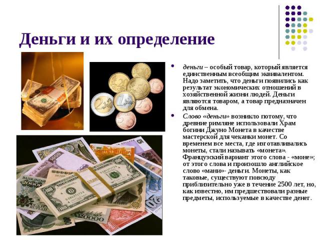 Деньги — это некоторая ценность, которая позволяет людям и учреждениям участвовать в сделках, результатом которых является обмен товарами или услугами.