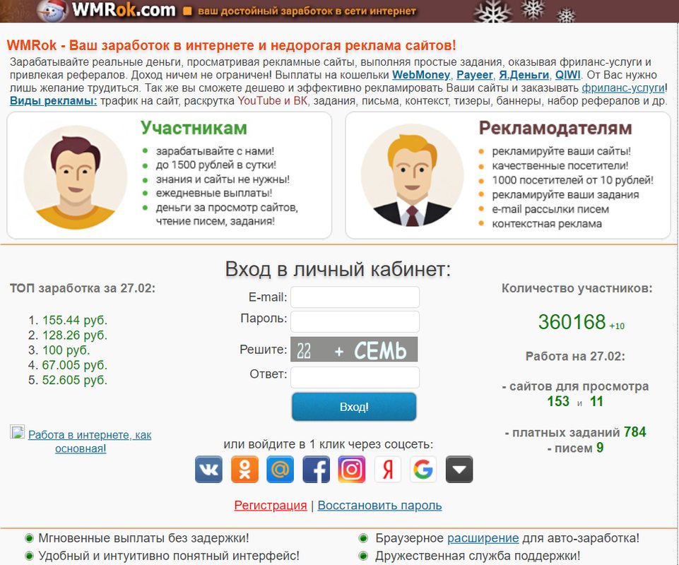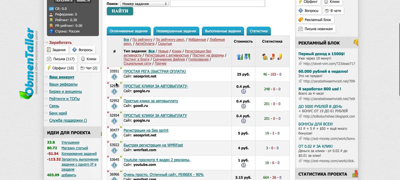 Здесь заработок на кликах, серфинге и заданиях рекламодателей. Очень хороший и интересный проект. На мой взгляд, в нем самый удобный и понятный интерфейс. Равных ему найти сложно! 100% платит. Интересная аудитория, нововведения. Уже многие другие сайты стараются его догнать. Для комфортной работы с сайтом я рекомендую вам программу WMPublic Agent :-). Кстати, минималки нет.