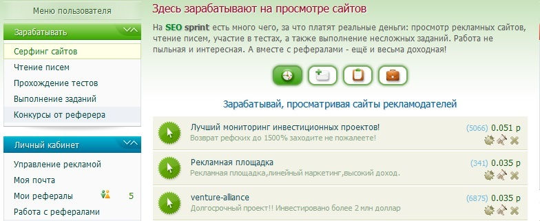 Лично я считаю этот проект одним из лучших, и очень рекомендую в нём остаться, работать и зарабатывать. Основная работа в 00 часов по серверу, будет практически всё: сёрфинг (около 100 страниц), письма, заработок на кликах, сайты с бонусами. Одновременно можно работать во всех трёх видах сёрфинга (автосёрфинг, ручной и VIP), сбора бонусов и ещё что-то одно из: писем и кликов. Заданий можно делать несколько в сутки (выбирать клики по разным рекламам, чистить куки или при смене вашего IP в течении суток).Это значительно увеличит ваш доход. Не забывайте брать ежедневный бонус за вход в аккаунт. Также есть бонус ежедневный на WMR кошелёк. Дополнительно бонусы на WMR кошелёк можно найти в разделе «Халява». На зтом проекте Вы сможете зарабатывать неплохие деньги, всё будет зависеть от того, сколько времени Вы проводите на сайте (т.