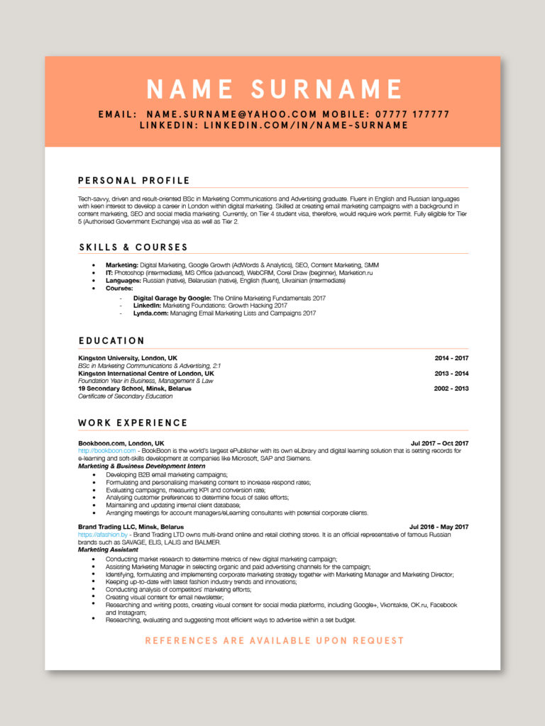 Если вы составляете CV сами, проследите, чтобы структура и разделы текста были корректны и удобны для чтения. Проверьте несколько раз, нет осталось ли в документе ошибок. Самую важную информацию укажите на первой странице, ведь именно её потенциальный работодатель увидит первой.