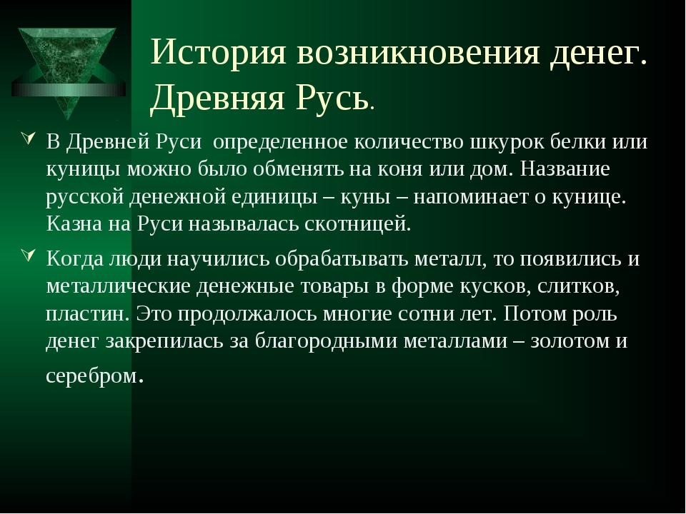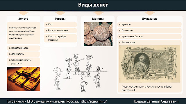 Деньги — это мера стоимости. Деньгами становится некий товар, который выступает в качестве всеобщего эквивалента, то есть все другие товары выражают свою стоимость в деньгах.