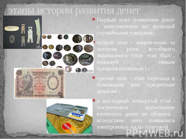 Сторонники эволюционной теории говорят, что деньги появились вне зависимости от желания людей, то есть появлению денег предшествовал длительный период эволюции обмена.