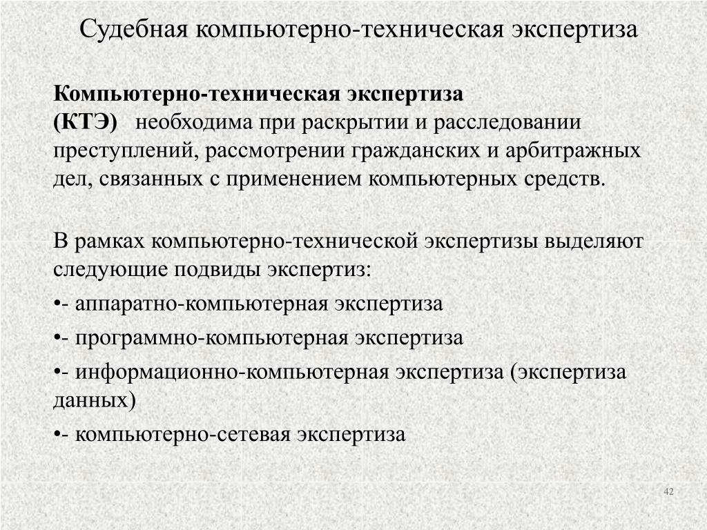 Компьютерно-техническая экспертиза — комплекс исследований компонентов компьютерной техники, сопоставление технических характеристик устройств с заданными в стандартах и нормативных требованиях, анализ программно-информационных систем, решение вопросов, связанных с нарушением авторских прав, установление причин и -следственное отношение, направленное на выявление дефектов и гарантийных случаев. Она может проводиться дополнительно к любым другим экспертизам.