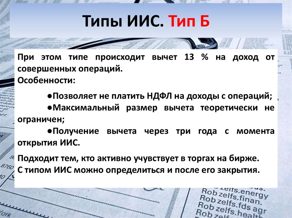 В отличие от типа А, у налогового вычета типа Б нет никаких ограничений в сумме льготы. То есть не важно, сколько вы заработали. Любая ваша прибыль, кроме дивидендов и купонов по облигациям, останется не тронутой подоходным налогом.