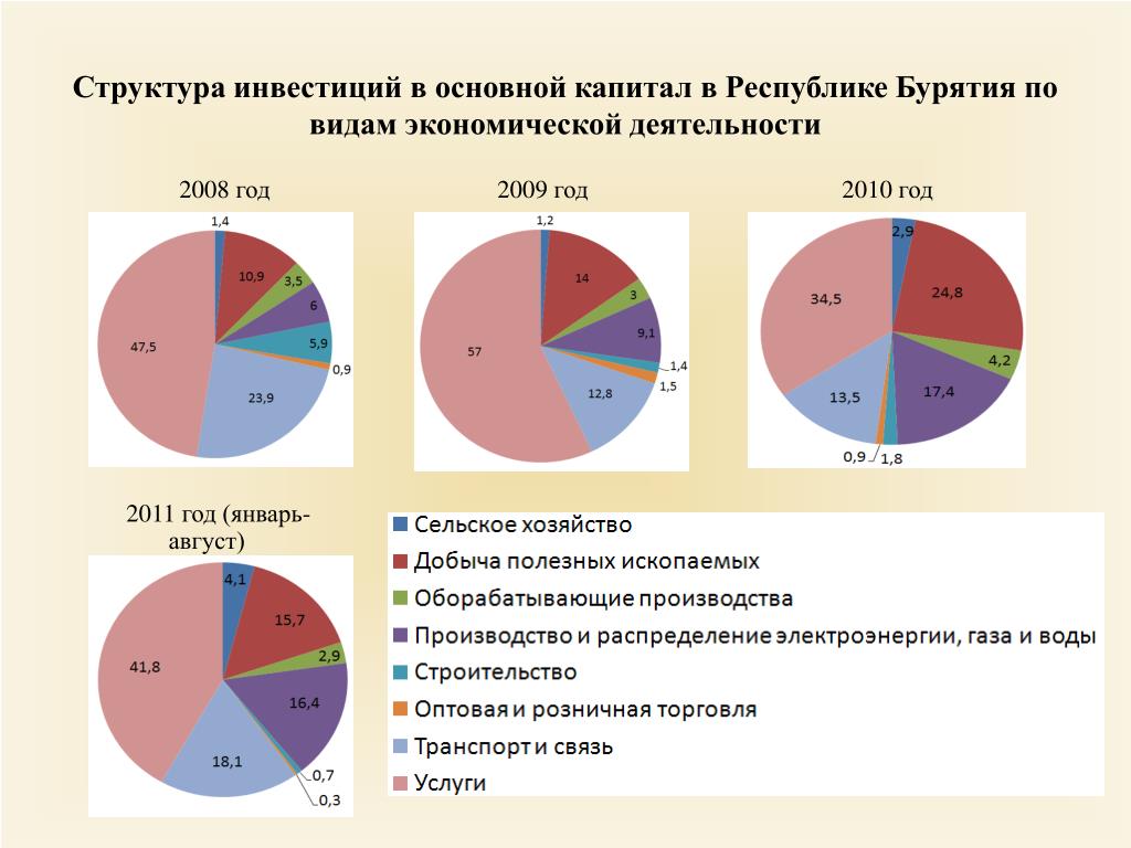 Структура инвестиций в основной капитал определяет эффективность использования финансового вложения. Ее состав формируется в соответствии с видом и направлением применения инвестиции. При оценке показателя результативности работы денег или ценностей, учитывается доля каждого составляющего элемента в общем их объеме.