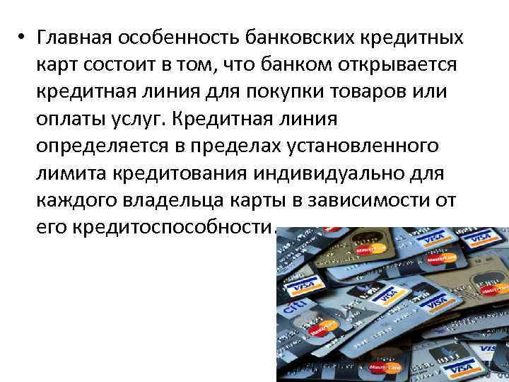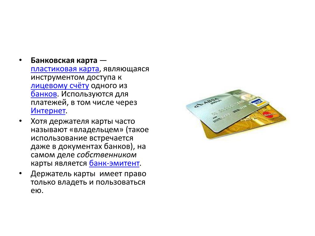 Кредитная карта: Физическая карта, привязанная к кредитному счету. Карту можно использовать для совершения покупок через этот кредитный счет.