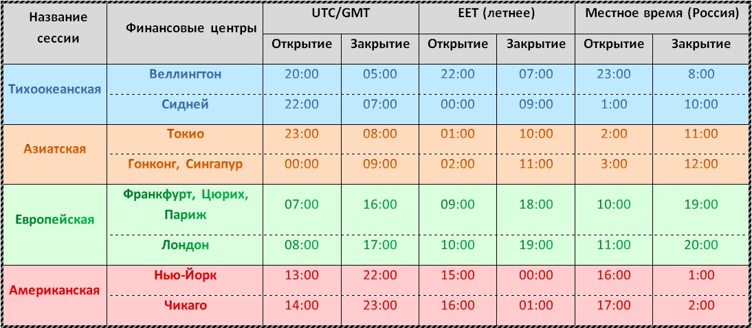 Торговые сессии на Forex не имеют конкретного расписания. Разные банки открываются в разное время, поэтому время указано ориентировочно в форматах GMT, EET (восточноевропейское) и MSK (московское).