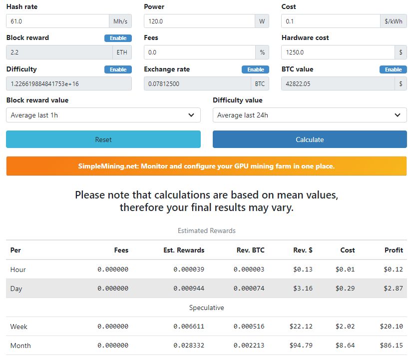 И мой компьютер, вероятно, потребляет 0,25 кВт в час при майнинге ETH. В результате мне нужно платить ~ 0,6 доллара США в день за электричество. - Таким образом, я зарабатываю ~ 7,43 долларов США в день (или ~ 222,9 долларов США в месяц) прибыли майнинга ETH с ПК RTX 2080 Ti прямо сейчас. Обратите внимание еще раз: этот показатель доходности может сильно различаться для вас, особенно в зависимости от цены Ethereum и стоимости электроэнергии 9.0018 .