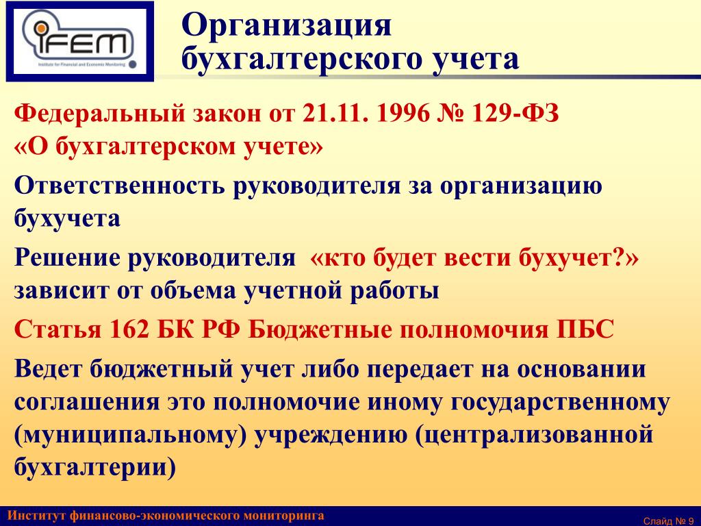Основным нормативно-правовым актом, регулирующим ведение бухгалтерского учета является Федеральный закон № 402-ФЗ «О бухгалтерском учете», согласно которому: