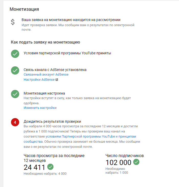 Плохая новость состоит в том, что возможность получить первые рубли появится далеко не сразу. Сначала нужно получить право на монетизацию, а для этого каналу требуется не менее 1000 подписчиков и 4000 часов просмотра.