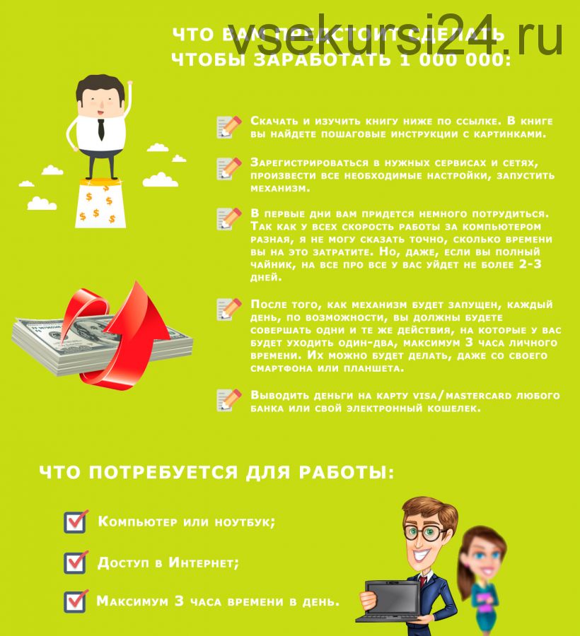 Деньги – это не самое главное в жизни, но они делают нашу жизнь легче и комфортнее. И хотя любовь, доброта, страсть и мудрость не продаются, деньги все равно играют для каждого из нас очень важную роль. И сейчас перед вами, как никогда ранее, открыто много возможностей заработать свой первый миллион, но только если вы, конечно, действительно хотите этого…