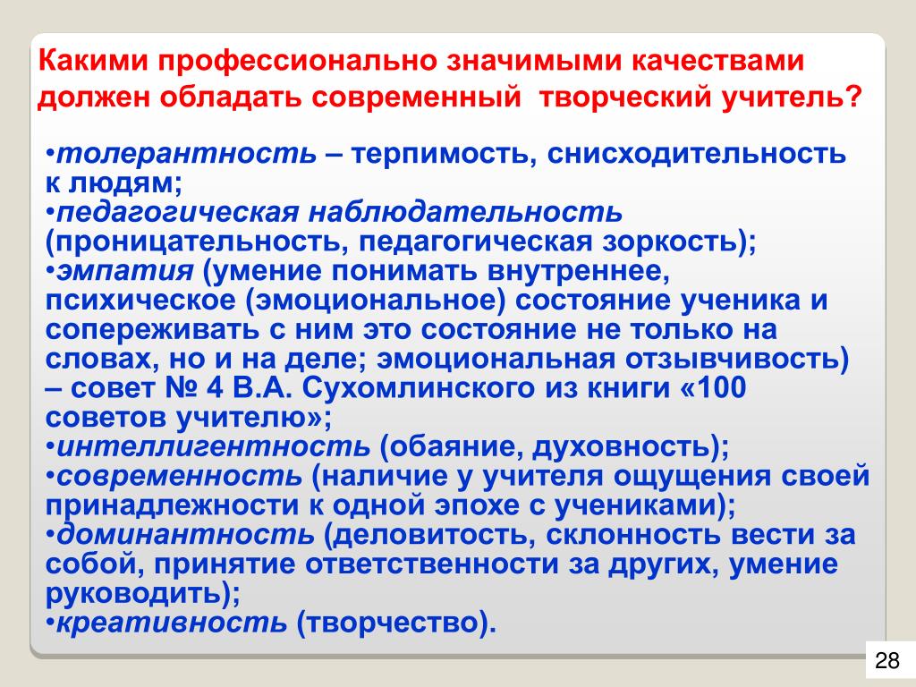 В процессе обучения важно не только понятно объяснять материал, но и увлечь рассказом, повести за собой учеников и замотивировать их к обучению. Без навыков лидерства и способности убеждать точно не обойтись. Однако наставник не должен быть слишком самоуверенным и считать, что его методы решения вопросов единственно верные.