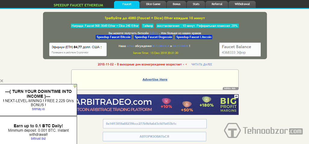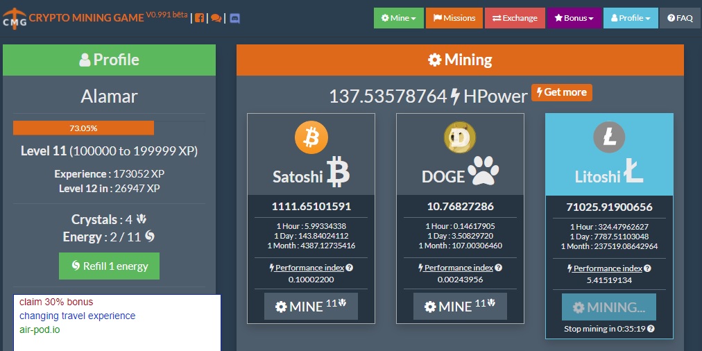 Виртуальная игра, в которой вы добываете биткойны и можете вывести их. Объявления размещаются на сайте для получения дохода.