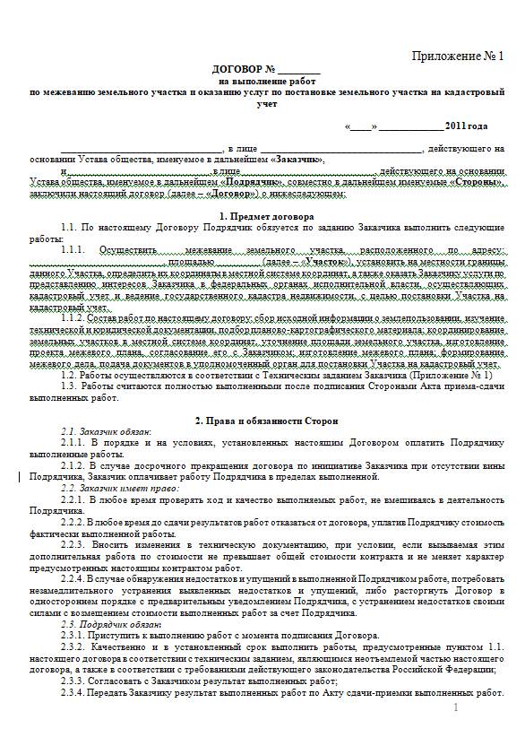 Кадастровые работы выполняются кадастровым инженером на основании заключаемого договора подряда в соответствии с требованиями Гражданского законодательства и Федерального закона (ст.35 ч.1 № 221-ФЗ « Федеральный закон от 24.07.2007 N 221-ФЗ (ред. от 21.07.2011) «О государственном кадастре недвижимости»).