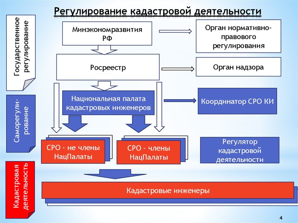 «Регистрация» (или «утверждение») кадастровых съемок часто связана с вопросами технического соответствия — кадастровые валидаторы нетерпимы к ошибкам — вместо того, чтобы концентрироваться на рисках, в то время как клиенты не терпят задержек в утверждении, поскольку они могут повлиять на затраты, размер прибыли и так далее. Сегодня государственное «вмешательство» в рынок требует обоснования, потому что частные лица и частный сектор часто лучше берут на себя ответственность за услуги, которые они запрашивают и предоставляют.