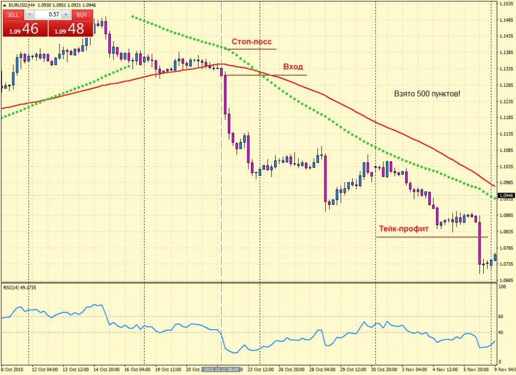 Как только начинается сильный тренд, сложно представить, какой из индикаторов будет давать более качественные сигналы в сторону этой тенденции, чем сами Скользящие cредние. Торговая стратегия «Рыбалка» предлагает работать на дневном графике, однако можно пробовать и более мелкие временные промежутки, но не снижать таймфрейм за пределы часового графика. Здесь используются специальные индикаторы, которые можно скачать, перейдя к подробному описанию работы системы «Рыбалка». Допускается открывать сделку на SELL, только, если на графике есть точки «сопротивления» ParabolicSAR. В такой ситуации также можно торговать, но только, когда точка ParabolicSAR появилась не позже, чем в течение 5-ти свечей с момента пересечения мувингов.