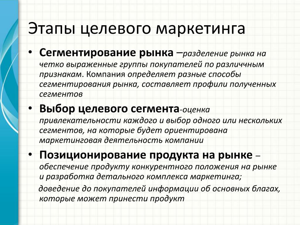 Вы, как маркетолог, должны решить, какое из этих желаний, т. е. какой из этих сегментов вам нужно использовать. Это то, что мы называем Таргетинг , а сегменты, на которые вы ориентируетесь в своих маркетинговых целях, называются Целевыми сегментами.