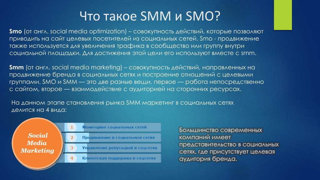 - Social Media Marketing (Социальный Медиа Маркетинг). Как мы понимаем из названия вся работа данного вида маркетинга находиться в социальных сетях. Важность тут составляет: установка контакта с аудиторией, увеличение лояльности и доверия к бренду.