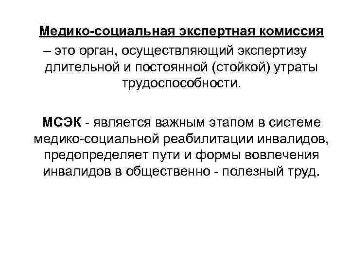 Медико-социальная экспертиза (МСЭ) – это группа экспертов, определяющая в установленном порядке потребности освидетельствуемого лица в мерах социальной защиты (в том числе степени ограничения способности к трудовой деятельности), включая реабилитацию, на основе оценки ограничений жизнидеятельности, вызванных стойким расстройством функций организма.