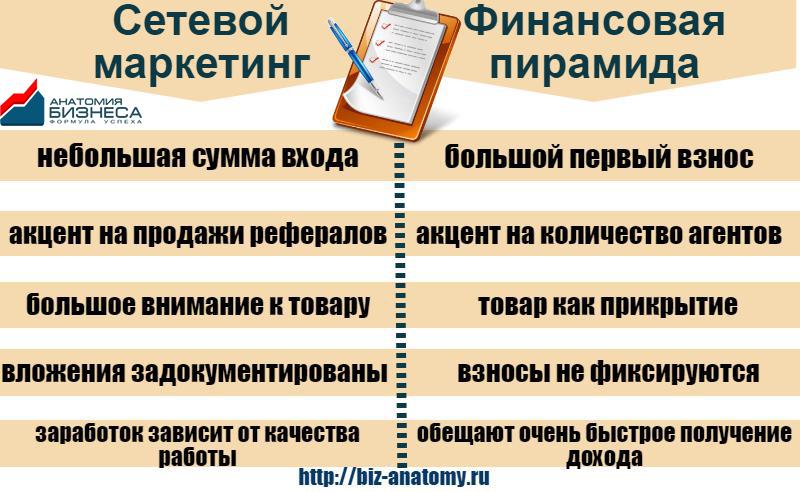 Так, вопреки распространенному мнению, сетевой маркетинг далеко не всегда построен по схеме пирамиды. Главное отличие — основа доходов. MLM получает прибыль от продаж реального продукта, а финансовая пирамида «зарабатывает» на своих же участниках — это могут быть первичные членские взносы, платные семинары.