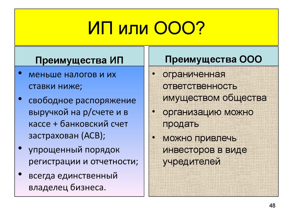 Современная действительность такова, что большинство российских предпринимателей, планируя открыть свой бизнес, обладает при этом весьма скромным бюджетом. Это обстоятельство чаще всего и играет решающую роль при выборе организационно-правовой формы. Ни для кого не секрет, что открытие ООО обходится в несколько раз дороже, нежели регистрация ИП. Однако спустя некоторое время, когда бизнес налажен, и намечается тенденция к росту предприятия, выбранная форма может стать преградой на пути к развитию собственного дела.