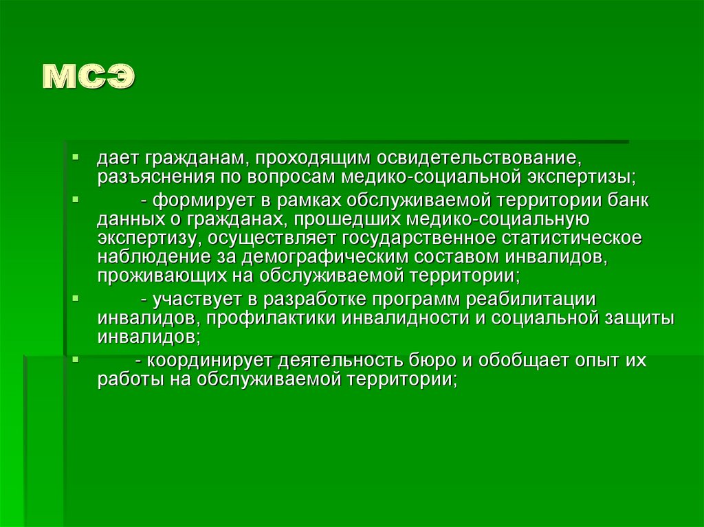 В установленном порядке позволяет признать человека инвалидом, в узаконенном государством порядке, если его заболевания или травмы подходят под закреплённый в законе перечень. Так же, процесс предполагает установку потребностей инвалидов, необходимости реабилитации, профилактики, возможности лечения заболевания. Так же, проводится оценка ограничений жизнедеятельности связанных с инвалидностью, разработка методов противодействия им; - Научно-методическое обеспечение абилитации и реабилитации ФБМСЭ. Федеральное бюро уже несколько лет занимается разработкой методических наработок, которые могут использоваться для реабилитации и восстановления некоторых функций органов после травм/болезней. Методическая документация, разработанная бюро МСЭ эффективно применяется во многих медицинских учреждениях;