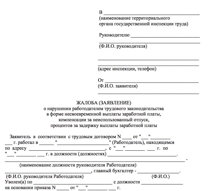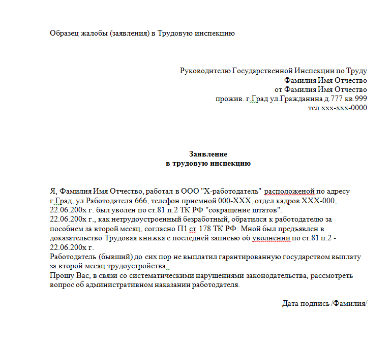 Иногда беседы с инспектором бывает достаточно, чтобы прояснить ситуацию, установив правоту работодателя. Если же окажется, что права работника подверглись нарушению, гражданину предложат написать жалобу в соответствии с представленным ему образцом.