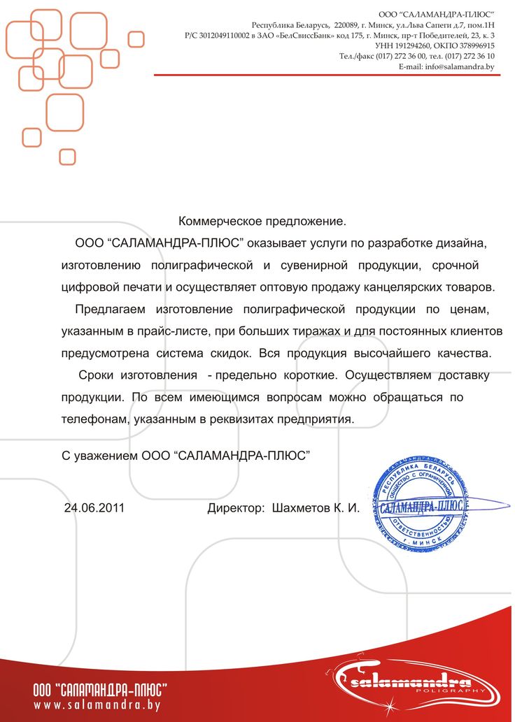 Коммерческое предложение – основной инструмент продажи. Именно c коммерческого предложения начинается знакомство потенциального клиента с Вашим продуктом или услугой. И от того, насколько правильно составлено и доставлено коммерческое предложение, зависит успех всей работы по совершению сделки. Коммерческое предложение отличается от прайс-листа или обычной спецификации на товар своим назначением, которое состоит не столько информировании клиента о предлагаемом товаре или услуге, сколько в том, чтобы побудить его покупке товара или воспользоваться услугой.