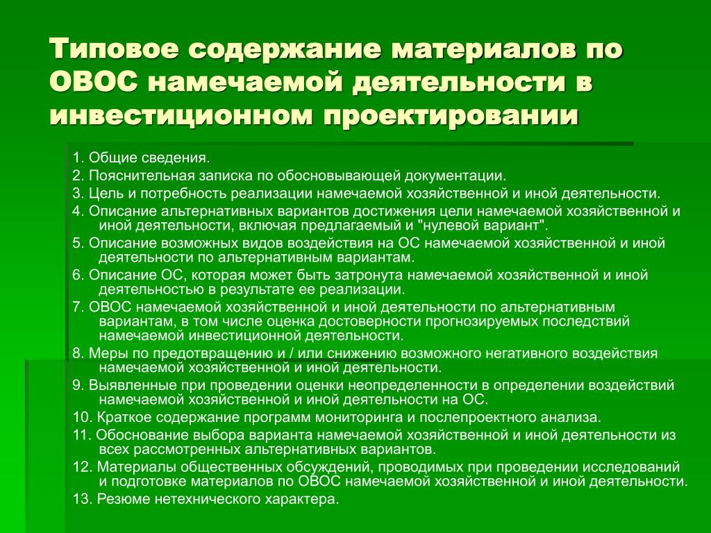 Таким образом, материалы оценки воздействия на окружающую среду включают в себя комплект документации, подготовленной при проведении оценки воздействия на окружающую среду планируемой (намечаемой) хозяйственной и иной деятельности.