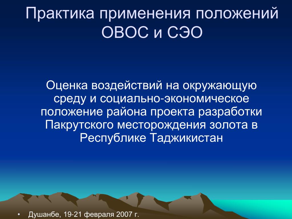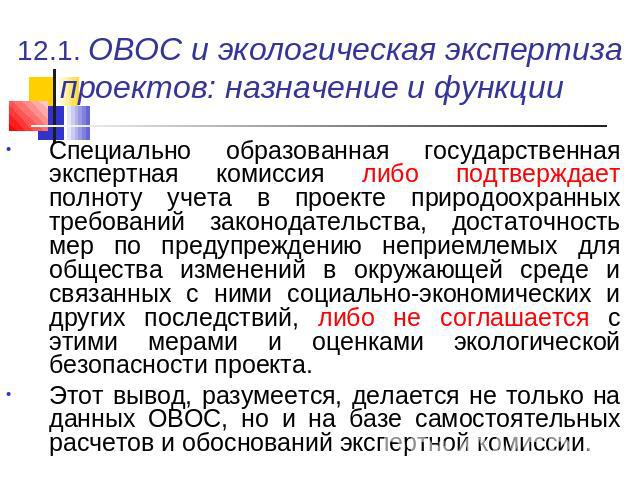 1 ФЗ «Об экологической экспертизе» экологическая экспертиза — установление соответствия документов и (или) документации, обосновывающих намечаемую в связи с реализацией объекта экологической экспертизы хозяйственную и иную деятельность, экологическим требованиям, установленным техническими регламентами и законодательством в области охраны окружающей среды, в целях предотвращения негативного воздействия такой деятельности на окружающую среду.