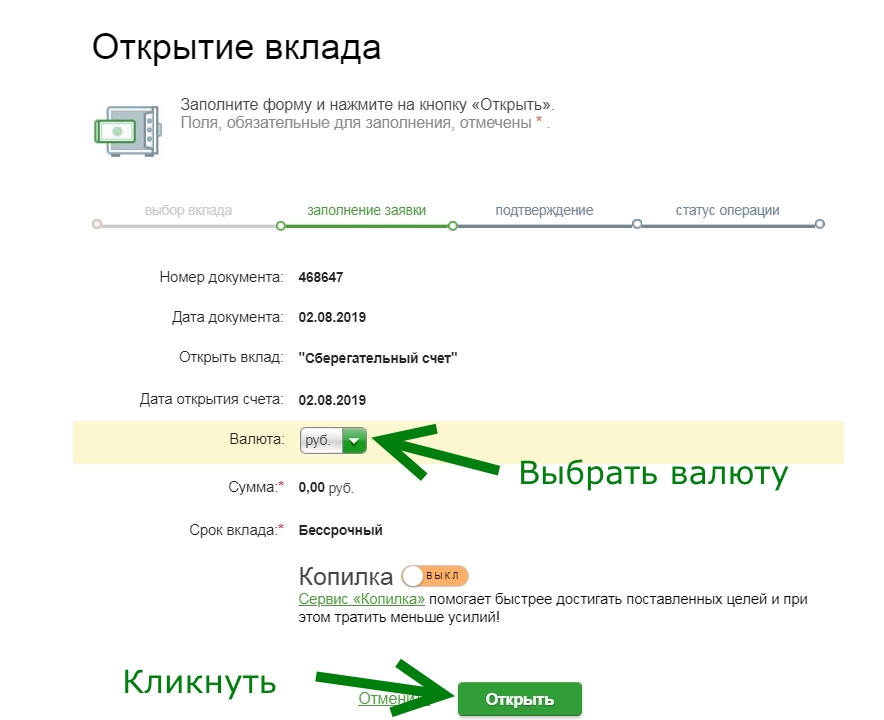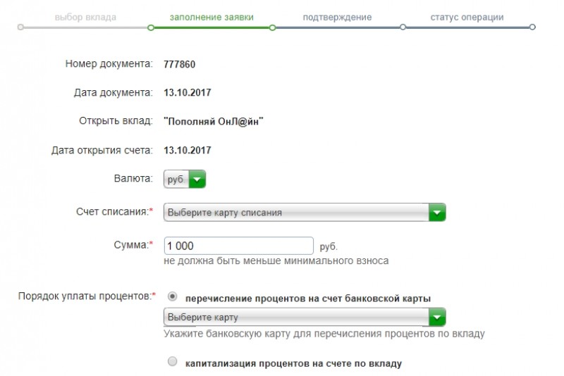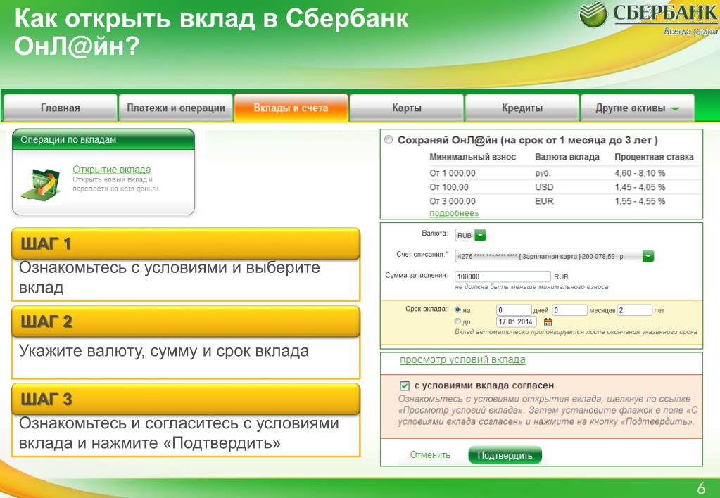 Сама процедура открытия депозита немногим отличается от обычной операции в интернет-банкинге. Клиент заполняет заявление на открытие вклада и одновременно передает поручение о списании с одного или нескольких его банковских счетов в размере суммы вклада. Подтверждением операции в настоящее время является использование клиентом разового ключа или электронно-цифровой подписи. В случае акцепта банком заявления клиента он предоставляет клиенту подтверждение об открытии вклада.