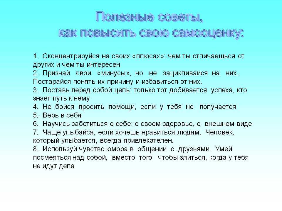 Узнайте, что вас вдохновляет. Люди с низкой самооценкой часто имеют длинный список того, что нельзя делать, говорит Файрстоун. У них могут быть неверные представления о том, на что они способны. Что помогает, так это бросить вызов этим мыслям и попробовать новые действия.