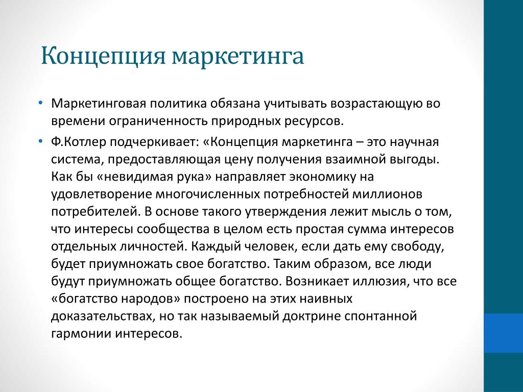 Концепция маркетинга строится на утверждении, что фирма должна выявить с помощью исследований нужды и запросы точно очерченного целевого рынка и обеспечить их желаемое удовлетворение. Концепция социально-этичного маркетинга провозглашает залогом достижения целей организации её способность обеспечить потребительскую удовлетворённость и долговременное благополучие и потребителя и общества в целом.