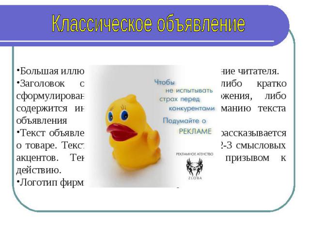 Другая важная особенность (опять из-за специфики рекламной коммуникации), что в большинстве случаев тезис заголовка совпадает с основным рекламным аргументом. Это обусловлено тем фактом, что в основном, читают только заголовки. Даже, если и прочитают основной рекламный текст, на нем не останавливают свое внимание так долго, как на заголовке.