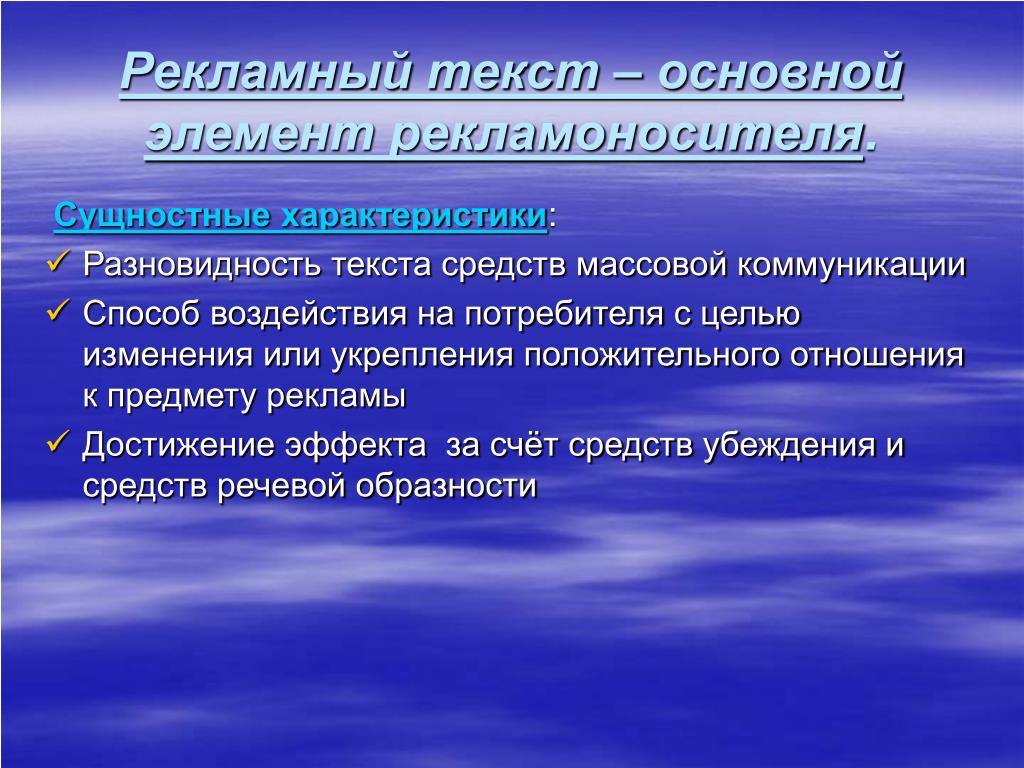 В основе рекламы лежит текст. Идея передается текстом. Картинку объясняет текст. Люди озвучивают текст в видеороликах, как собственные мысли, которые должны откликнуться в душе, чтобы мы купили.