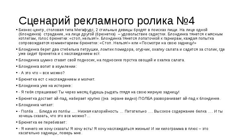 Гениальные, хорошо продуманные тексты к аудио и видео трудно найти и еще труднее забыть. Образцовые примеры коммерческой рекламы вызывают у заказчиков желание сделать также, но за совершенно другой бюджет. Это усложняет процесс. В итоге заказчик идет в низкопробное рекламное агентство, где ему пишут «нечто» похожее на рекламный текст.