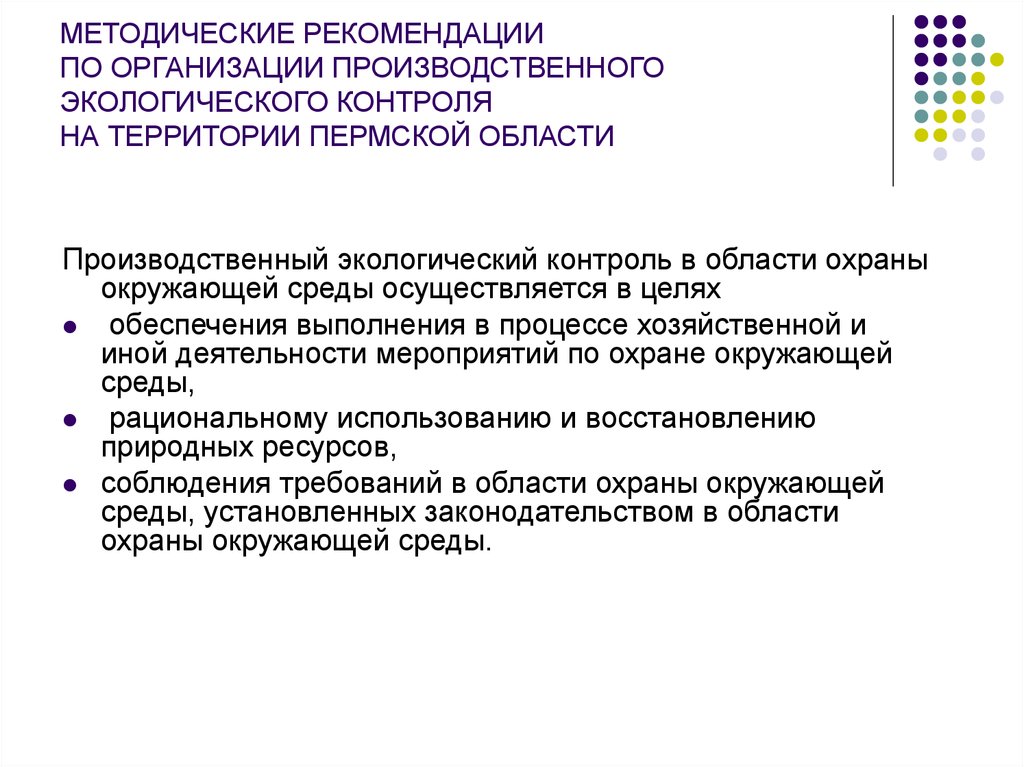 Организация производственного экологического контроля регламентирована Федеральным Законом № 7-ФЗот 10.01.2002 «Об охране окружающей среды». Природопользователи должны бережно относиться к окружающей среде и постоянно искать возможности для минимизации вредного воздействия. В соответствии с этим программа производственного экологического контроля ПЭК преследует следующие цели: