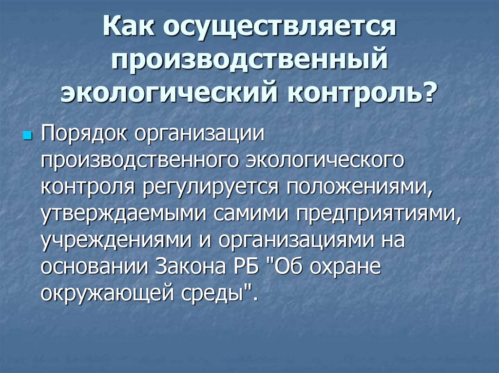 Производственный экологический контроль осуществляется в рамках определённого предприятия, организации или иного хозяйственного объекта.