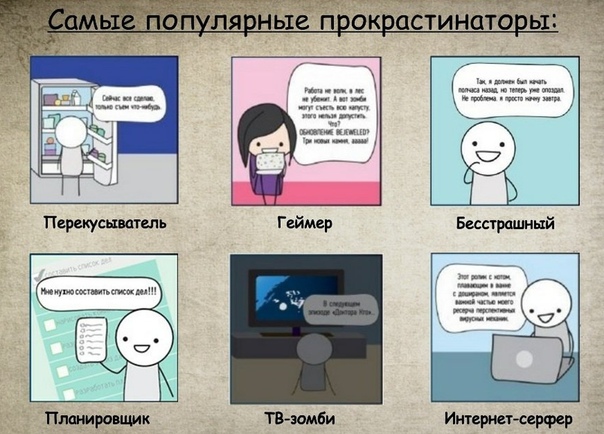 Перед тем как сесть за работу или учебу они устраивают перекуры, перекусы или бесконечно просматривают ненужную информацию.