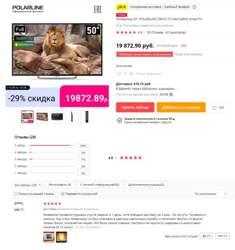 В том случае, когда у продавца низкий рейтинг, маленький процент положительных отзывов или он продает товар на «Алиэкспресс» всего пару месяцев, ждать от него качественный товар не стоит.