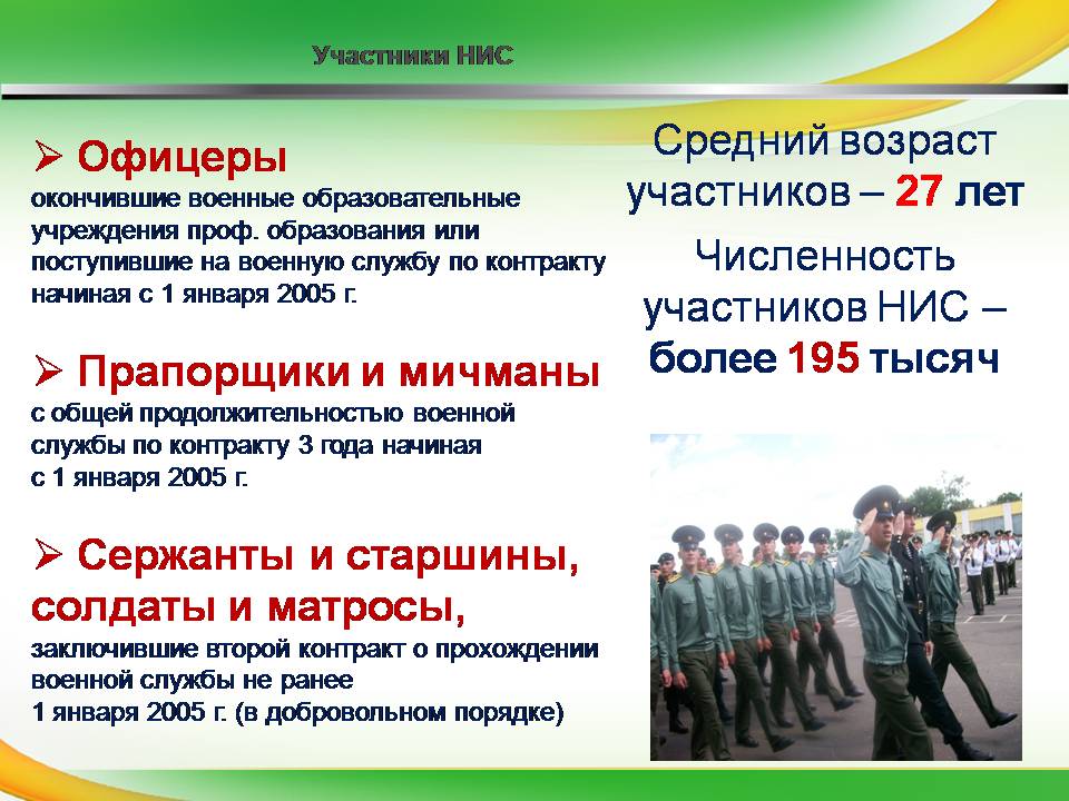 Госпрограмма НИС начала функционировать в 2005 году. За время работы она уже успела доказать свою эффективность. Подтверждением этого служит тот факт, что ежегодно количество контрактников, которые приобрели жилье в рамках НИС, значительно увеличивается. Реализацией этой программы занимается ФГКУ «Росвоенипотека». Для того, чтобы стать участником госпрограммы, контрактнику необходимо три года отслужить в рядах армии РФ. После этого он имеет возможность реализовать военную ипотеку.