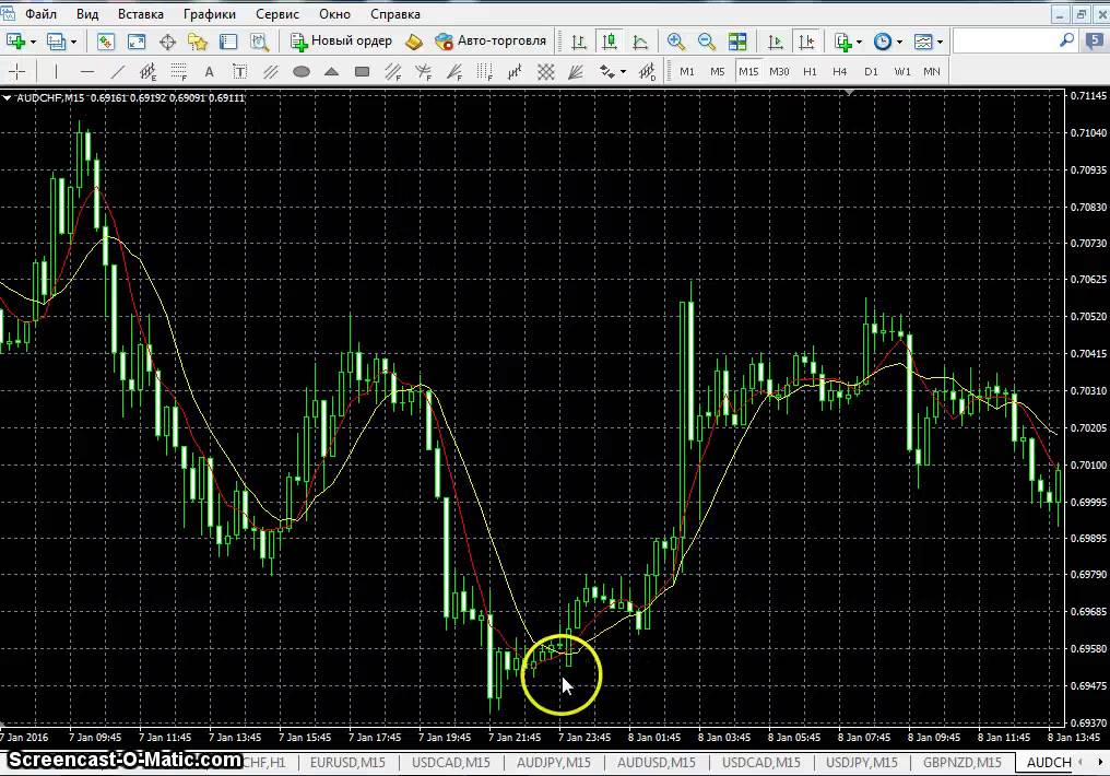 Вход в рынок: при пересечении скользящих, если они направлены вверх, нужно открыть ордер на покупку, а если АО имеют направление вниз — продажу. Выход, закрытие ордера: при их пересечении в обратном направлении. Что интересно, это очень простая ТС, достаточно «старая», но тем не менее эффективная.