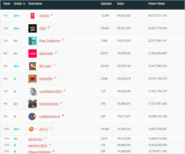 Сегодня существуют сайты, которые на основе большого количества факторов позволяют увидеть приблизительные цифры заработка того или иного блогера. Одним из таких ресурсов является портал, размещенный по адресу https://socialblade.com/. Вбив в форму название канала или имя его владельца, можно получить сведения о количестве подписчиков, возможном диапазоне заработка и пр. Ниже представлена краткая информация о доходах нескольких популярных каналов и блогеров на YouTube: