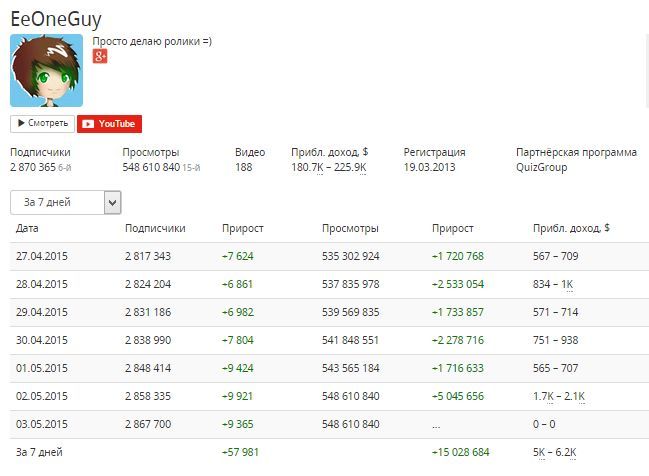 Для этого создан специальный сайт – socialblade.com. С его помощью можно узнать, как обстоят дела на вашем канале и у конкурентов. Тут есть возможность выяснить, сколько видео было просмотрено пользователями за прошедший день, количество человек, подписавшихся на тот или иной канал, и каковы доходы его владельца.