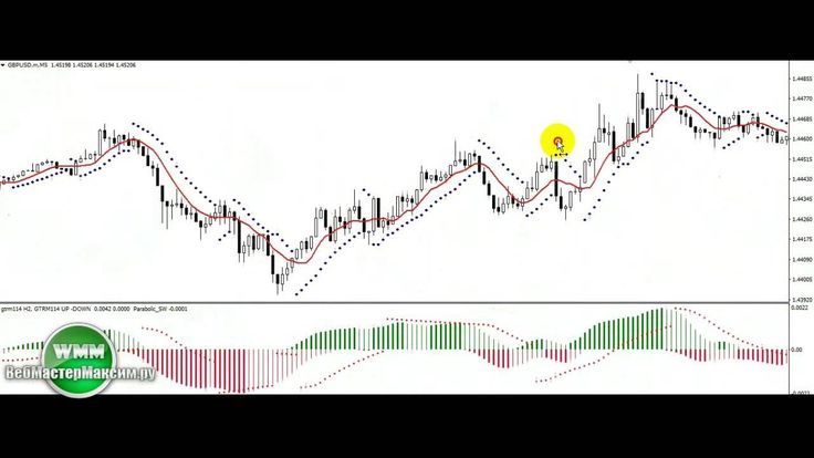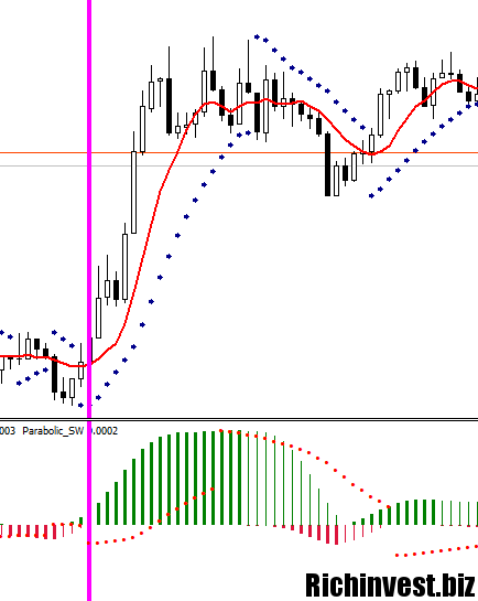 - Столбцы гистограммы Parabolic SW окрашены в красный цвет и находятся ниже нулевого уровня. Точки индикатора расположены выше гистограммы.