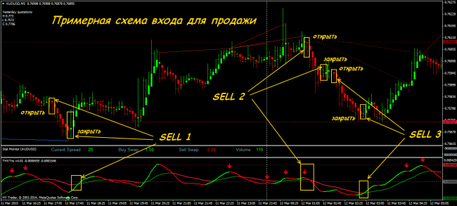 При наличии всех трех сигналов можно открывать сделку на продажу.