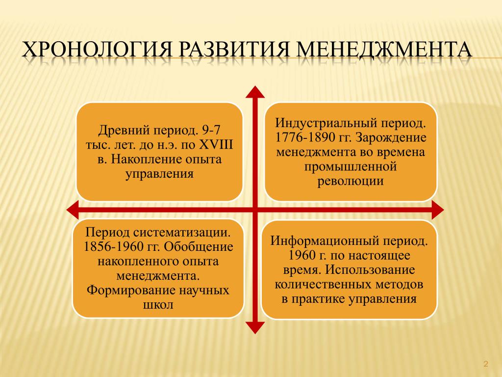 Концепция управления существует уже тысячи лет. Согласно Пиндуру, Роджерсу и Киму (1995), элементарные подходы к менеджменту восходят по крайней мере за 3000 лет до Рождества Христова, когда священники Ближнего Востока впервые записали записи о деловых отношениях. Сократ около 400 г. до н.э. заявил, что управление — это компетенция, совершенно отдельная от обладания техническими навыками и знаниями (Higgins, 19).91). Римляне, известные своими легионами воинов во главе с центурионами, обеспечивали подотчетность через иерархию власти. Римско-католическая церковь была организована по принципу определенных территорий, субординации и должностных инструкций. В средние века, в течение 1000 лет примерно с 476 по 1450 год нашей эры, гильдии, собрание ремесленников и торговцев, поставляли товары, сделанные вручную, от хлеба до доспехов и мечей для крестовых походов. Существовала иерархия контроля и власти, подобная той, что существовала в католической церкви, в которой власть принадлежала мастерам и переходила к подмастерьям и ученикам.